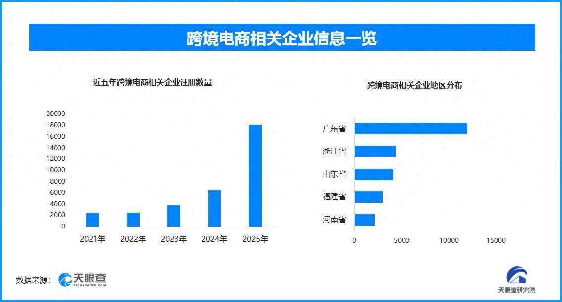 天眼查专业版数据显示,截至目前我国现存在业、存续状态的跨境电商相关企业超4万家。其中,2026年截至目前新增注册相关企业约2800余家,从企业注册数量趋势来看,近五年间,跨境电商相关企业的注册数量呈现出逐年增长的态势,并在2025年达到顶峰。
